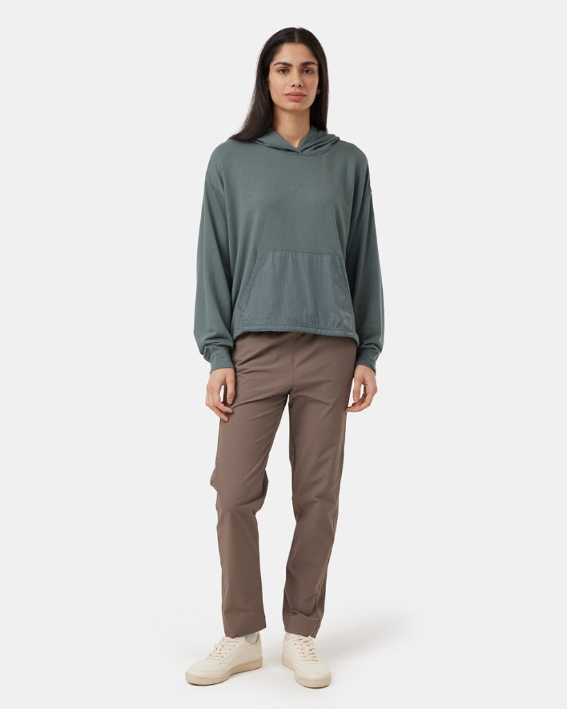 Fashionable, functional and earth-friendly, This hoodie is made from sustainable materials like organic cotton and modal — with recycled nylon on the hood and pocket to protect from moisture.